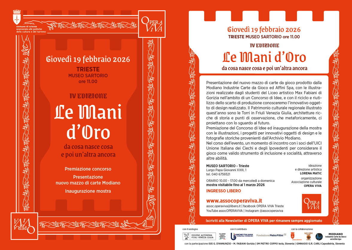 Mostra con le illustrazioni selezionate nel Concorso di Idee realizzate dagli studenti del Liceo artistico Max Fabiani di Gorizia confluite nel nuovo mazzo di carte Modiano, con i progetti che hanno valorizzato lo scarto di produzione per innovativi oggetti di design e le immagini storiche provenienti dall’Archivio Modiano. Cerimonia di premiazione del Concorso, presentazione del nuovo mazzo di carte Modiano e un incontro con i soci dell’Unione Italiana Ciechi ed Ipovedenti per sottolineare l’importanza del gioco come valido strumento di inclusione e socialità.